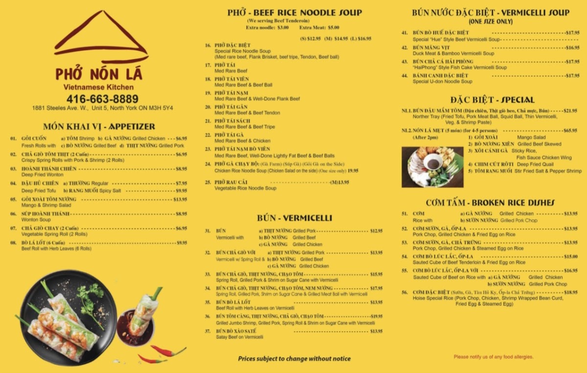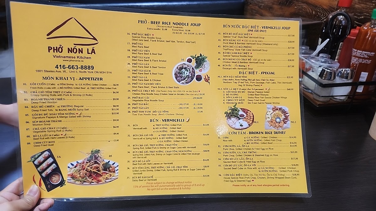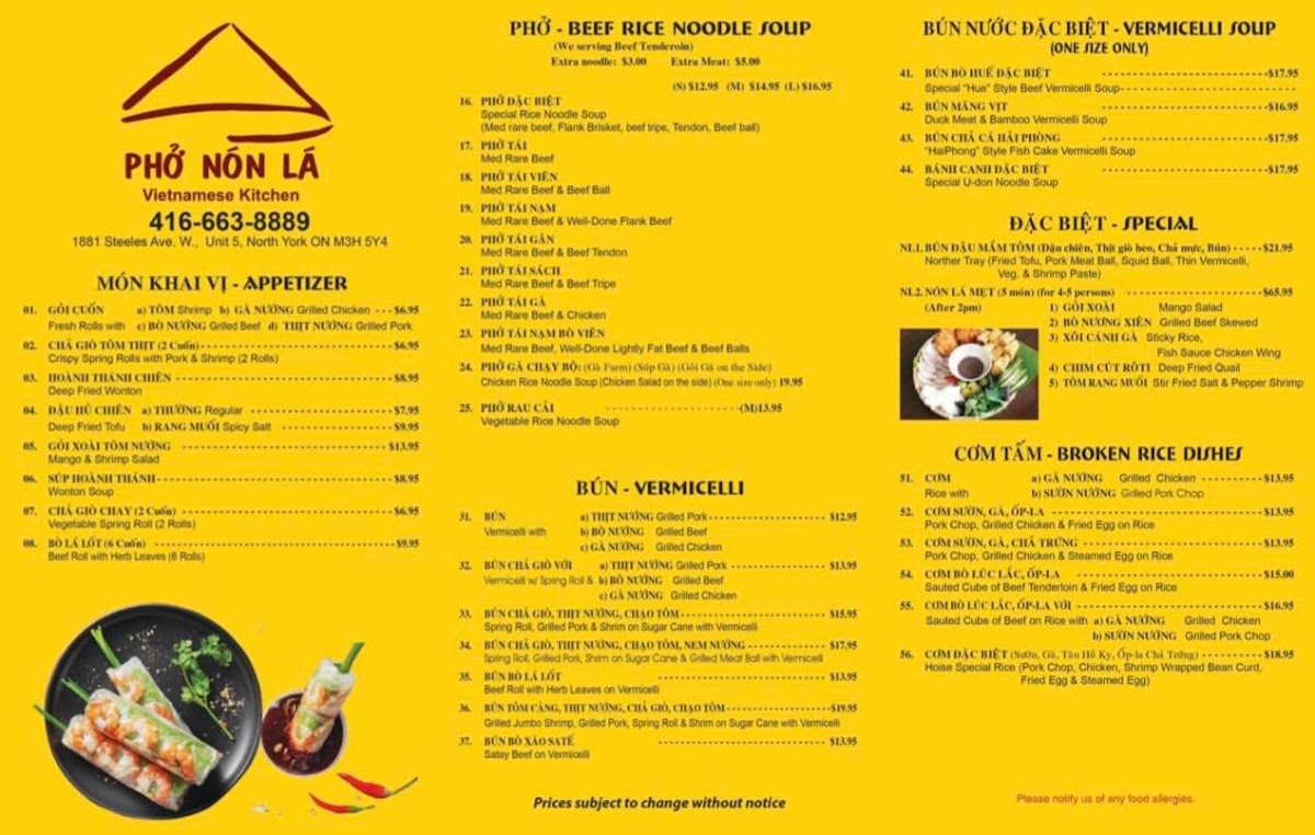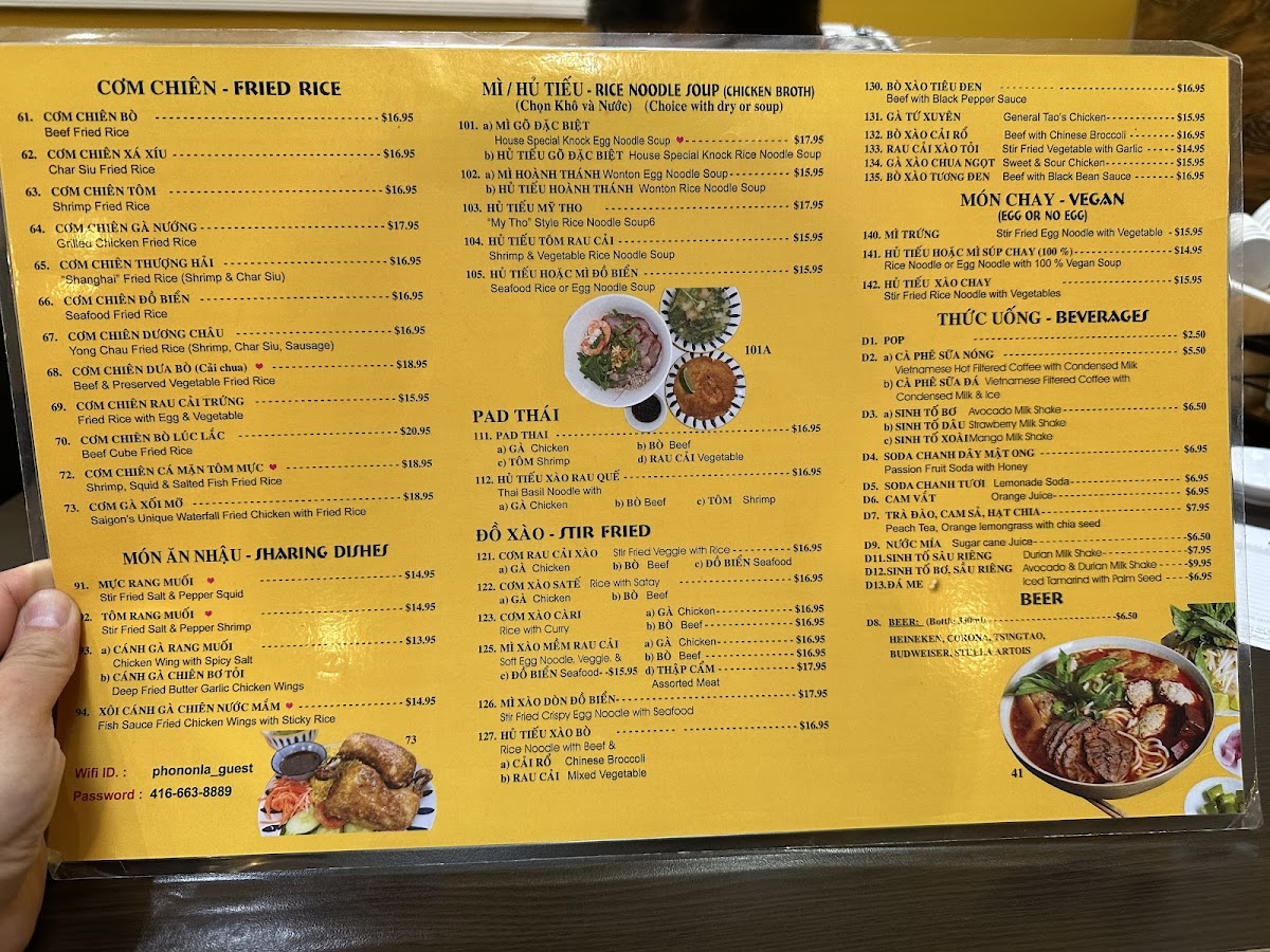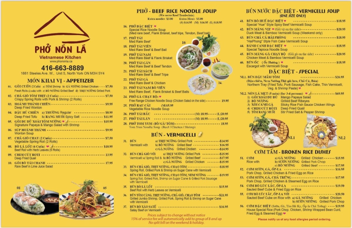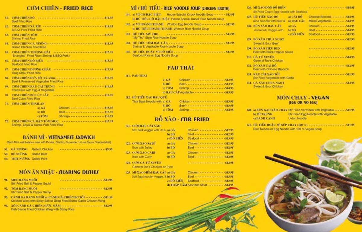 The menu at PHO NON LA offers a variety of traditional Vietnamese dishes across several categories, suitable for casual dining at any time of day. Patrons can find an assortment of soups, rice dishes, noodle specialties, and small plates designed for sharing or light meals.