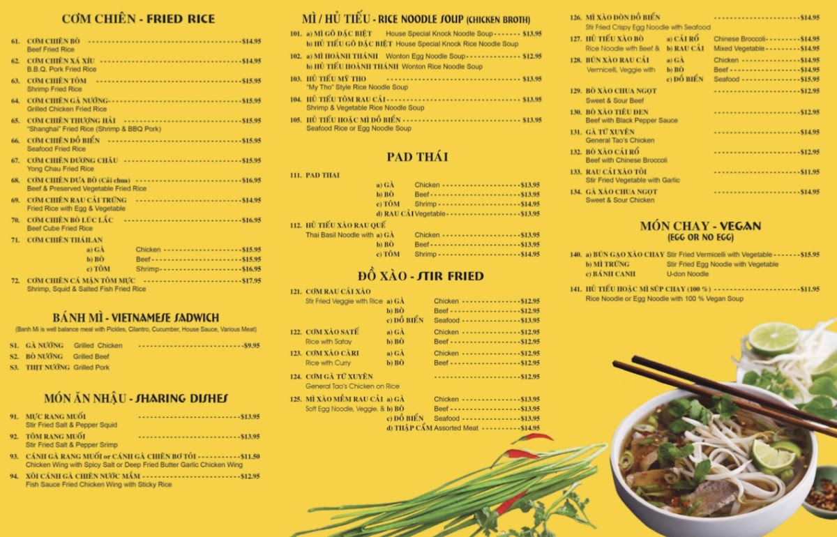 - Vegan and Vegetarian Options: Includes dishes labeled as Món Chay, such as Hủ Tiếu Hoặc Mì Súp Chạy and Hủ Tiếu Xào Chạy, catering to plant-based preferences.